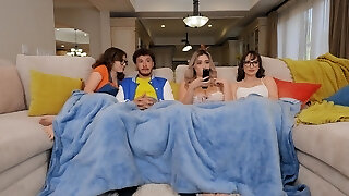 India Summer romps with nerdy stud while blindfolded mustached fellow seeks for them