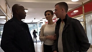 Big Black man seducing a skinny white platinum-blonde for deepthroat and sex