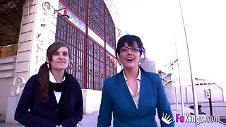 Teen brown-haired has interracial threesome with black studs and does ass fucking