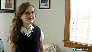 Handsome red haired college babe Veronika Fare is fucked by one clean-shaved headed fellow