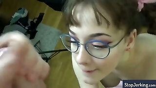 Nerdy milf diligently swallows mighty cock until happy ending on face